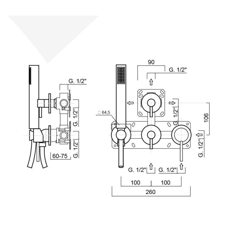 Con parte incasso GGBOX 5305, deviatore a rotazione, predisposizione kit doccia, 4 uscite libere