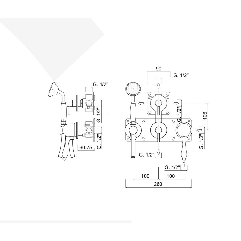 Monocomando doccia incasso con deviatore, kit duplex integrato, 4 uscite libere, Praga Mix