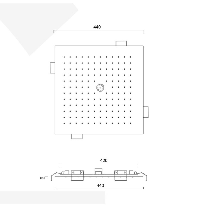 Nome prodotto: Soffione incasso quadrato acciaio inox, a molle getto pioggia e laminare, 440x440 mm