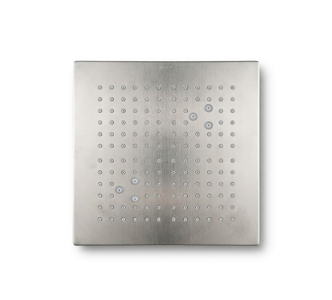 Nome prodotto: Soffione quadrato incasso 404 x 404 mm, acciaio AISI 316L, 1 getto pioggia, 6 getti nebulizzati, RAINPLAIN 3232