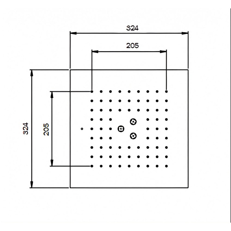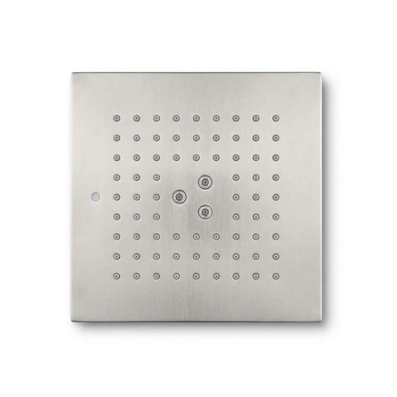 Nome prodotto: Soffione quadrato incasso 324 x 324 mm, acciaio AISI 316L, 1 getto pioggia, 3 getti nebulizzanti, RAINPLAIN 3232
